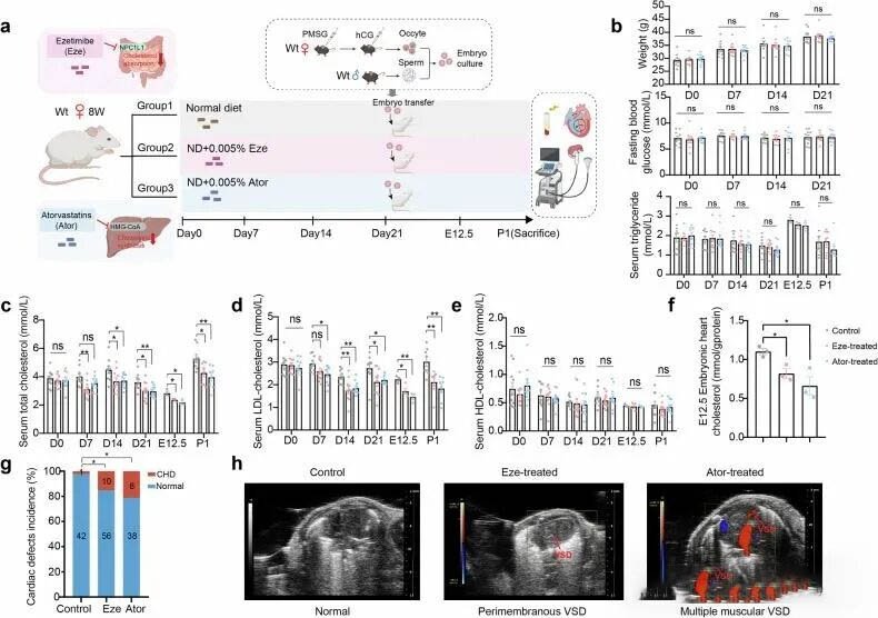研究者给怀孕的小鼠妈妈吃降胆固醇药(依折麦布或阿托伐他汀),模拟人类胆固醇低的状态。